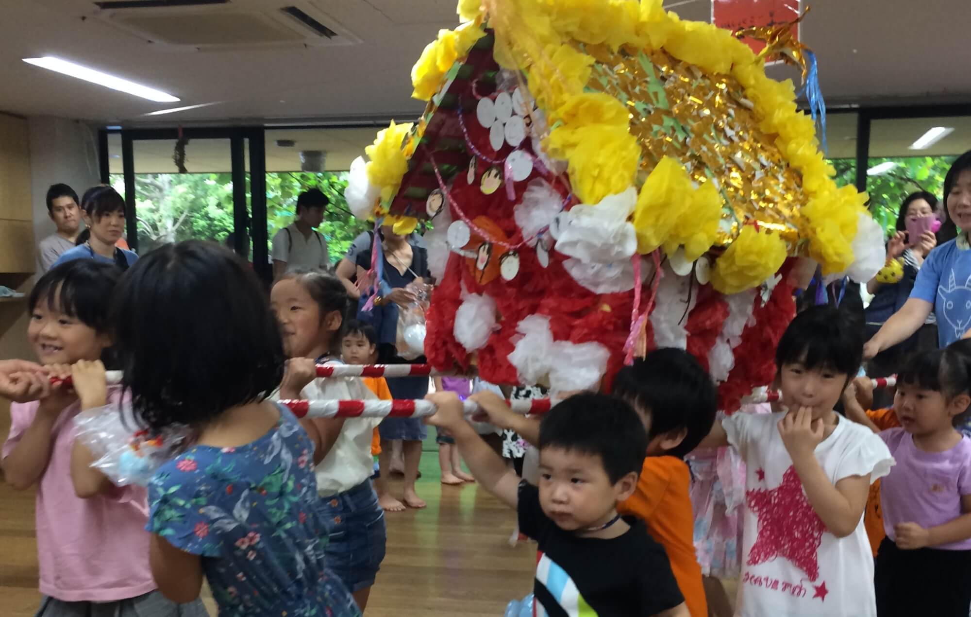 楽しそうな盆踊りに一緒にリズムに合わせて体を動かしたり、おみこしを追いかけて一緒に「わっしょい」と掛け声をあげたり、食べ物をほおばったり、子どもたちが思い思いにお祭りを楽しんだ体験学習となりました。