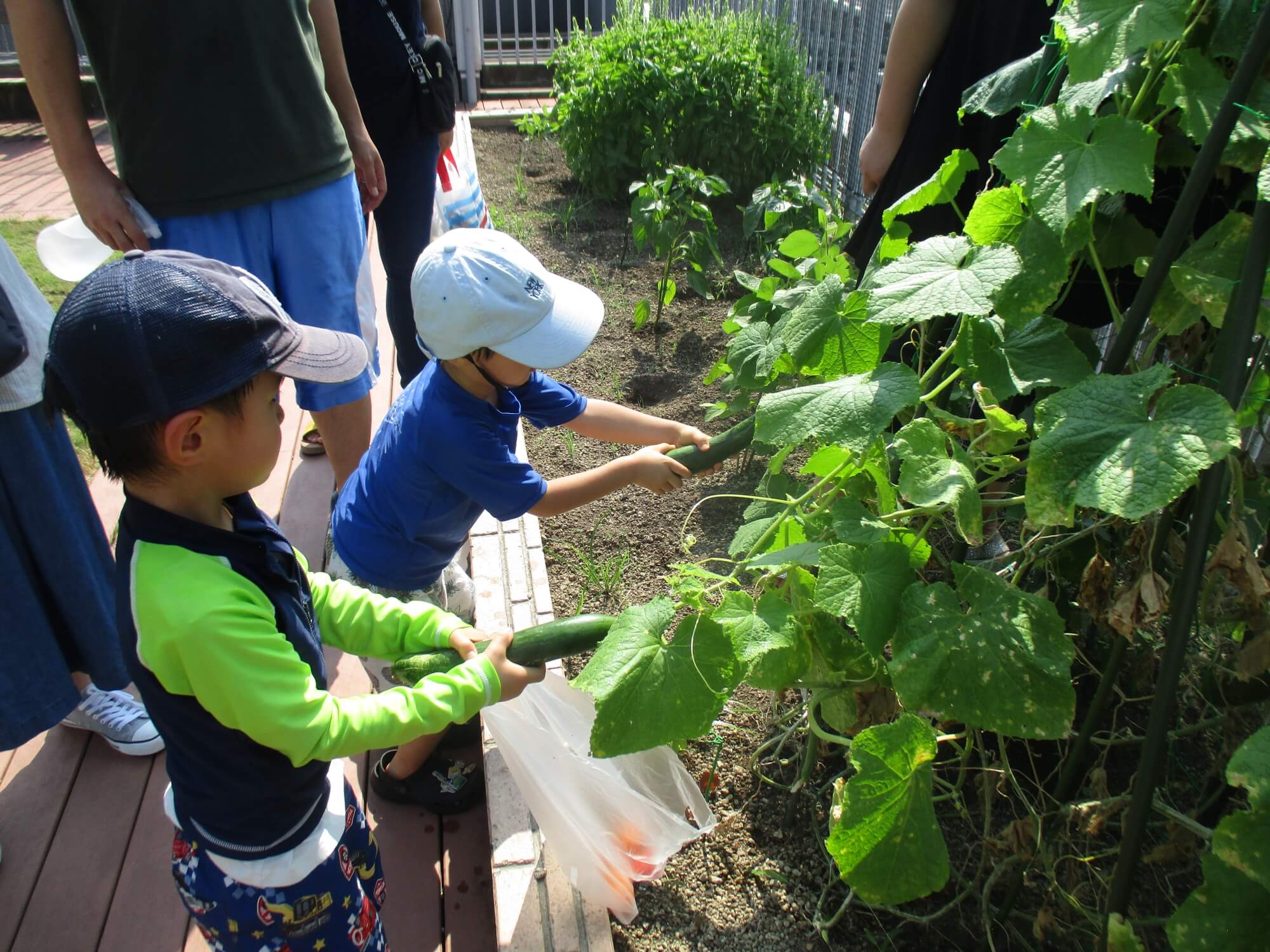 ヘチマに近いぐらい大きなきゅうりを子供たちは力いっぱい引っ張って収穫しました。
