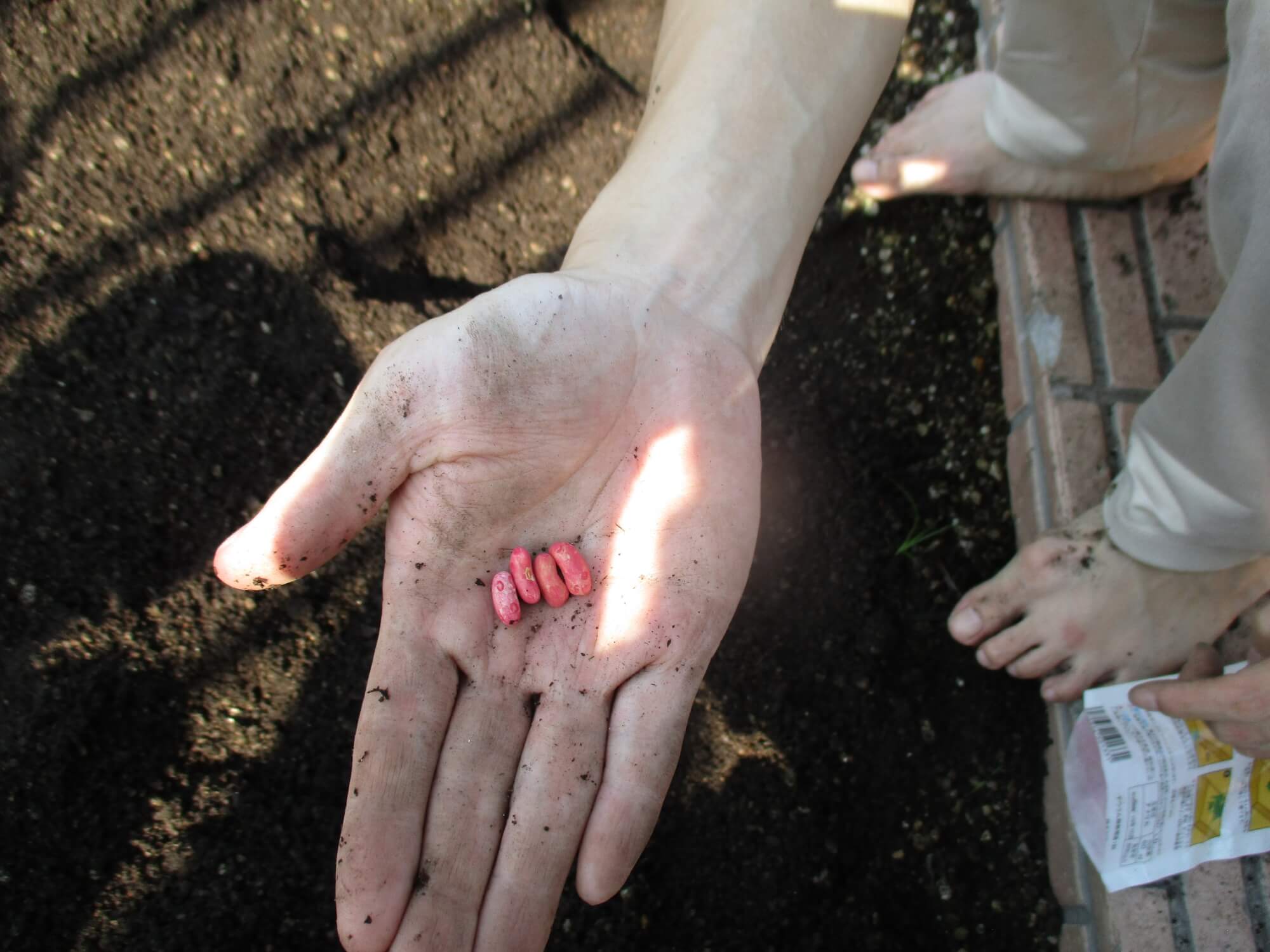 そして、いんげんの種を植えました。品種によりますが、いんげんの種ってピンク色の種があるのご存知でしたか?職員も子どもと一緒に勉強しました。