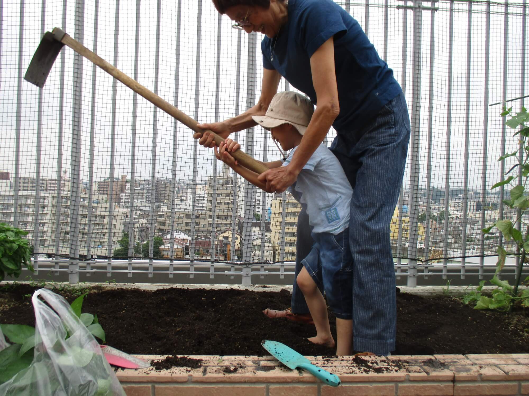 土作りだって自分たちでやるんです。鍬だって、危なくたって一緒に体験します。
