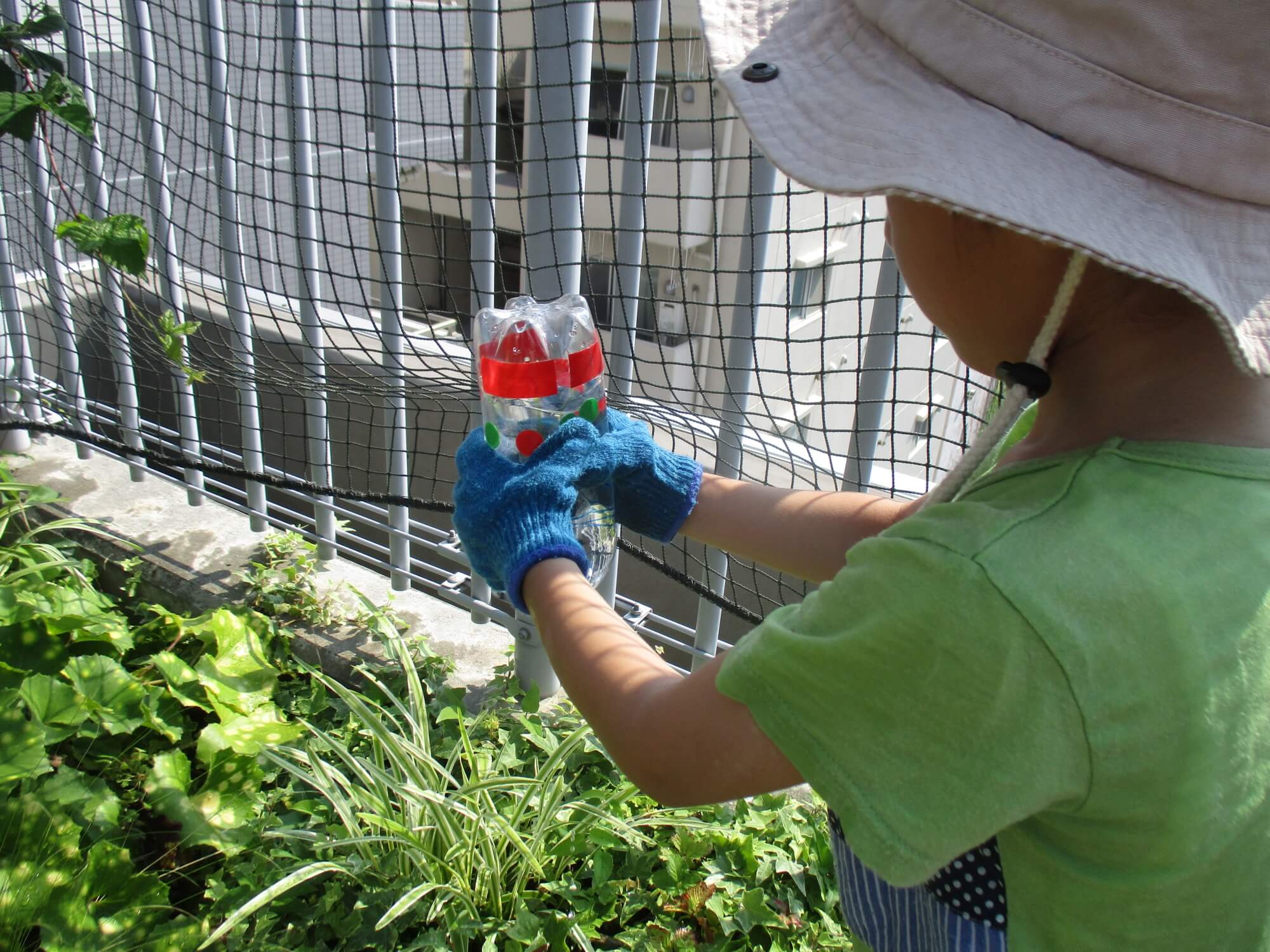 先月までは買った霧吹きで水遣りをしていましたが、今月は子どもたち自身で作ったオリジナルじょうろで水遣り。