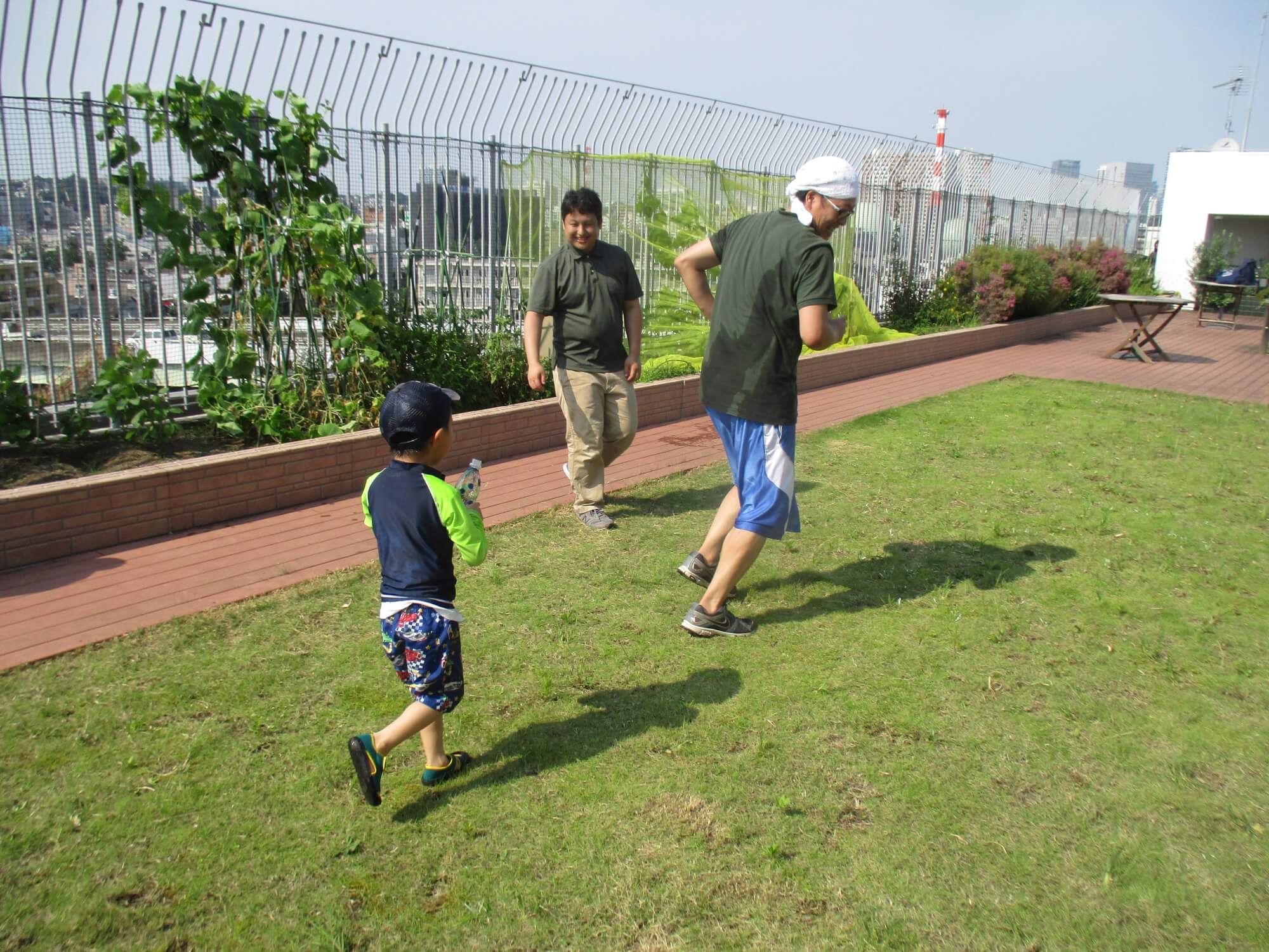 子ども達が鉄砲の用に水が出るものを手に持つと…もちろん、こうなります。「水鉄砲」は、最初は「ブシュー」とつぶして掛けていた子ども達が、いつの間にかキャップを外して腕を精一杯振って職員に水を掛けてくる。掛けたり、逃げたり、笑ったり、西区の空に笑い声が響き渡りました。