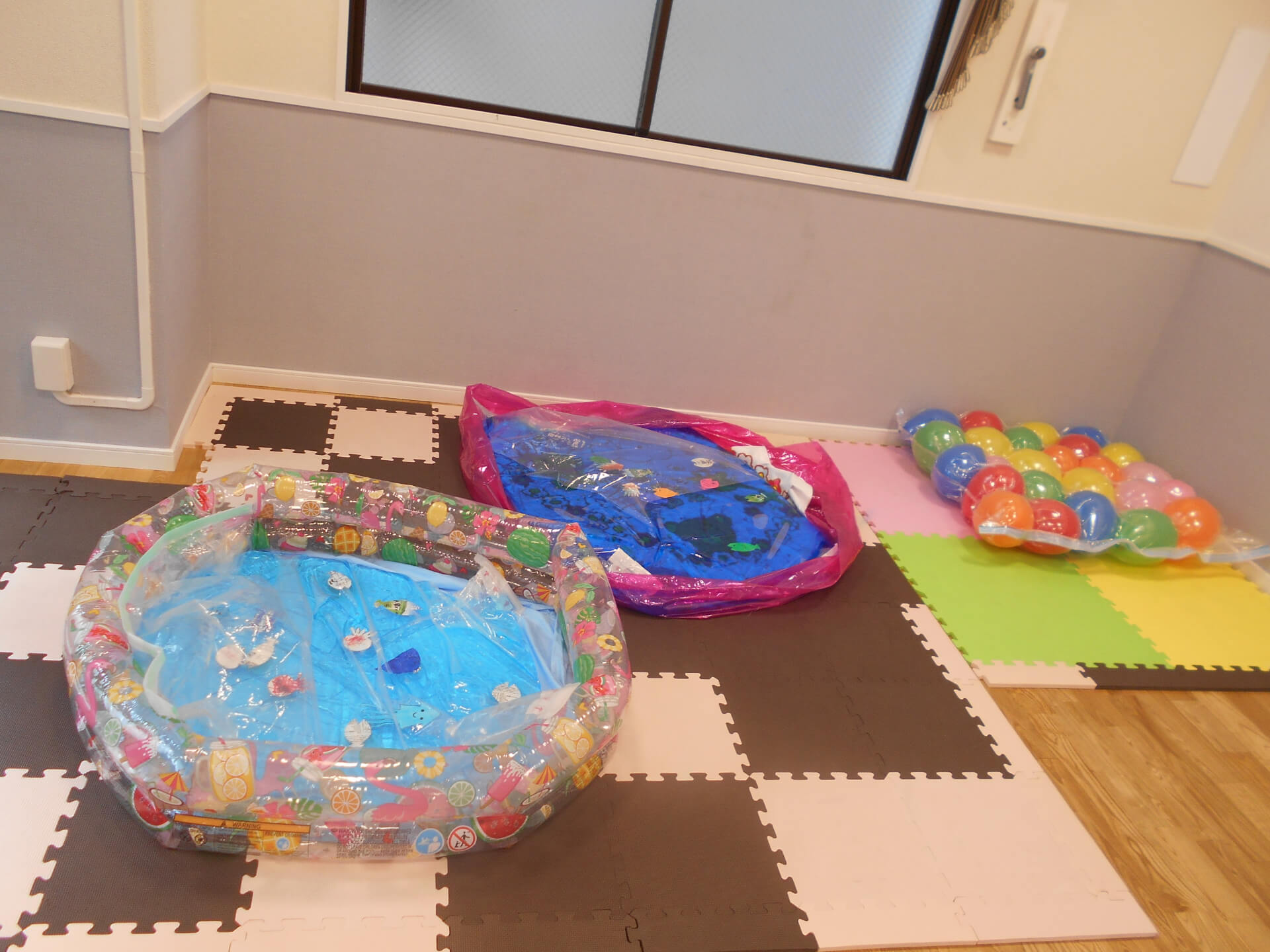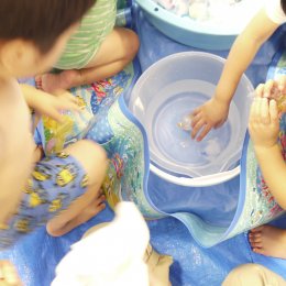 色とりどりの詰まったバルーンマット。すぐに割れてしまいそうに見えますが、実はとっても丈夫です。子どもたちは飛んだり跳ねたりして大はしゃぎ。カラフルな風船を見ていると、気分も弾んでくるね。海をイメージしたウォーターマット。マットの上は柔らかく、ひんやりとして良い気持ち。手足を風船が動かすたびに水は波のように動きます。水の中には、子どもたちが作ったお魚がたくさん泳いでいます。自分が作ったお魚はどこにいるかな?