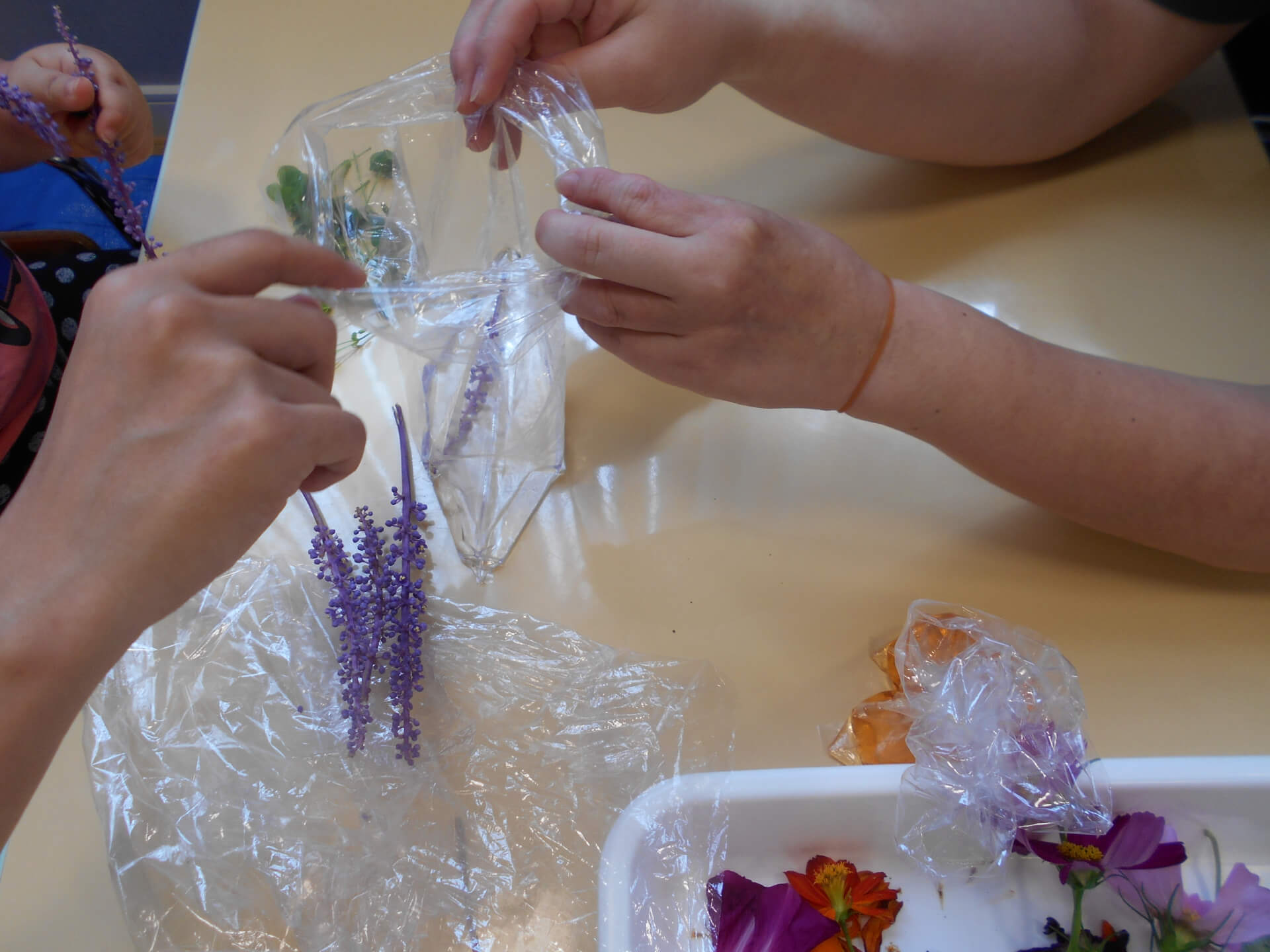 草花コーナー。子どもたちにも草花を持ってきてもらい、色水作りや塗り絵をしました。自分で持ってきた草花で作品ができるなんて、わくわくするね。出来上がった作品を「見て!」と誇らしげに見せる子どもたちの表情は、とても輝いて見えました。