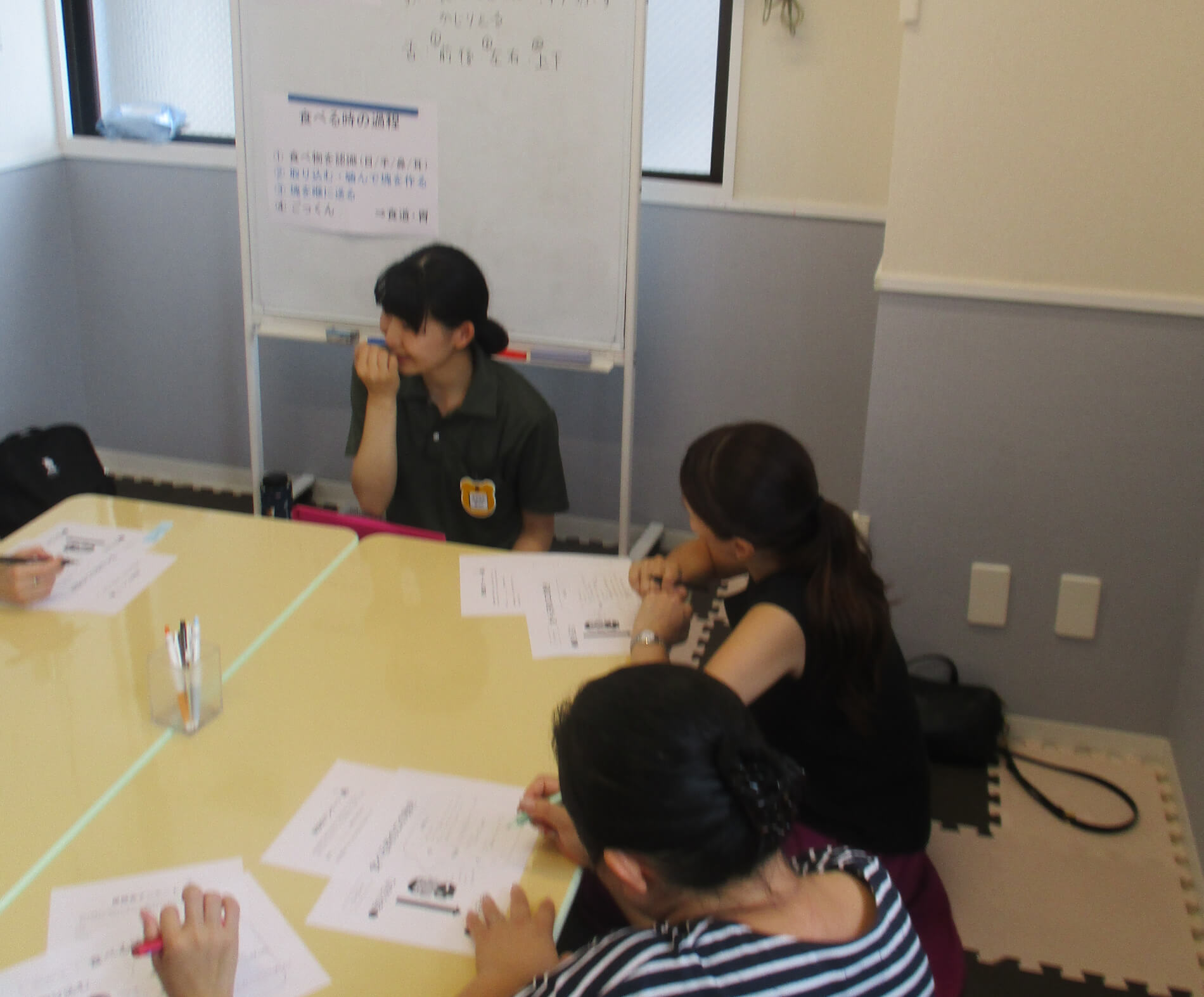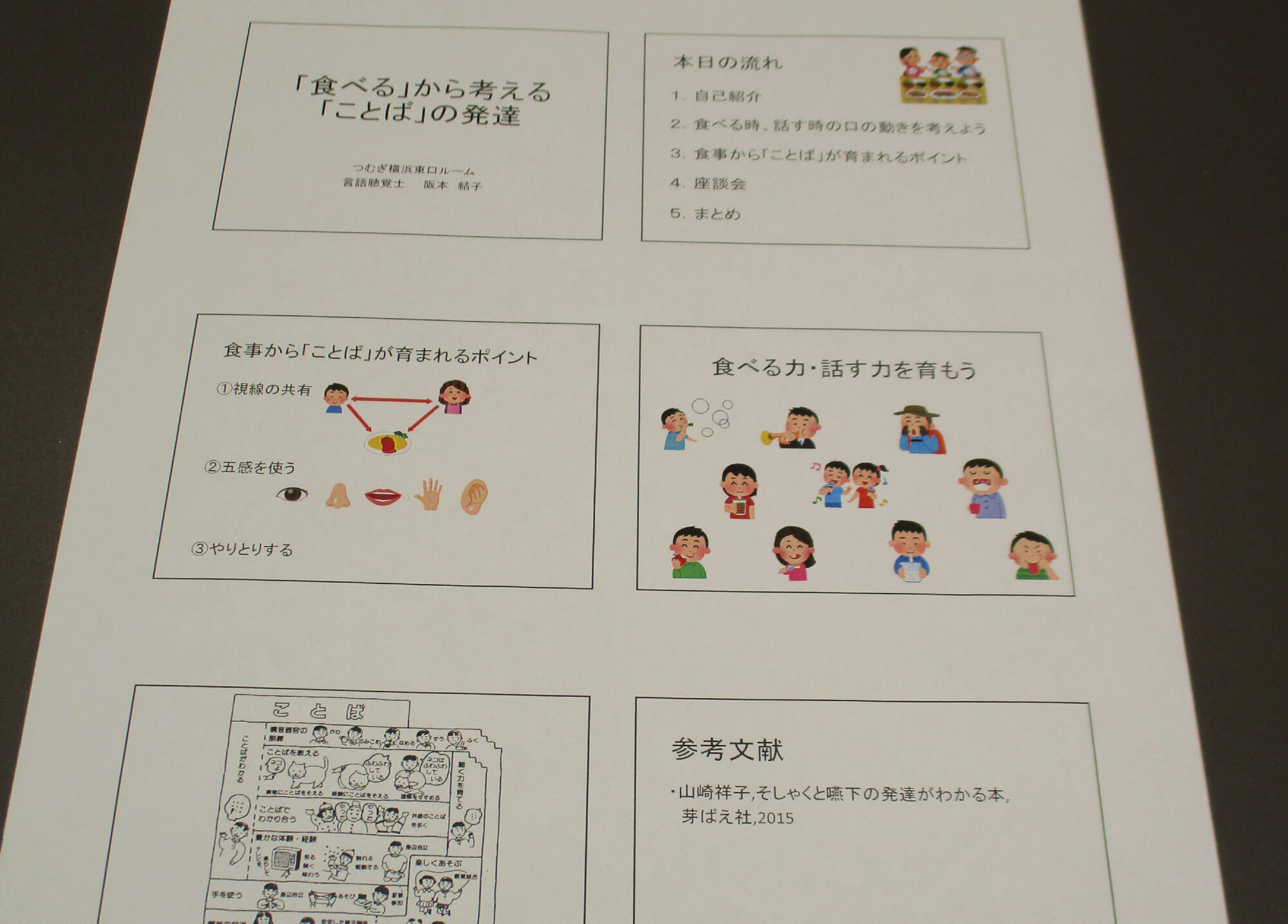 発達支援つむぎ横浜東口ルームでは、「『食べる』から考える『ことば』の発達」をテーマにした、保護者様向けの座談会を開催しました。乳幼児期の子どもの発達は、日常の生活や遊びの中で育まれますが、食事場面はコミュニケーションや言語発達が促される絶好の機会とも言われています。今回は「口」の動きに注目して、毎日の食事について考えました。