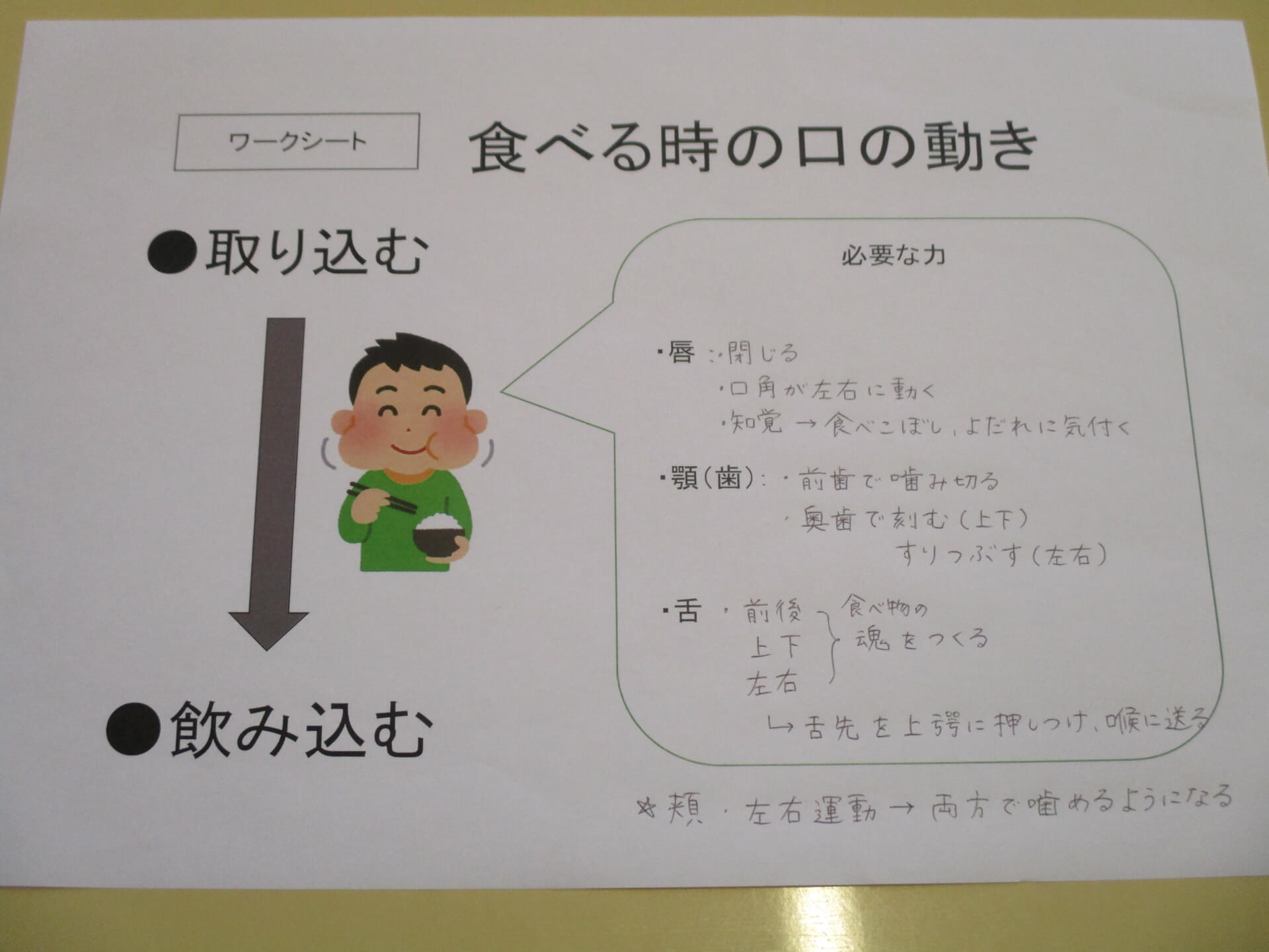 まず、食べる時の口の動きについて考えてみましょう。私達は食べる時に、「1:食べ物を五感で認識する」「2:食べ物を取り込む」「3:食べ物を噛みながら喉に送りやすくする(食べ物の塊を作る)」、「4:食べ物の塊を喉に送る」「5:飲み込む(ごっくん)」といった過程を経て食べ物を体に取り込みます。今回は、その中でも食べ物が口の中に入っている2と3の時に必要な力について、ワークシートを使って話し合いました。たった一言で「食べる」と表現される行為でも、様々な力が組み合わさって行われているということが分かります。