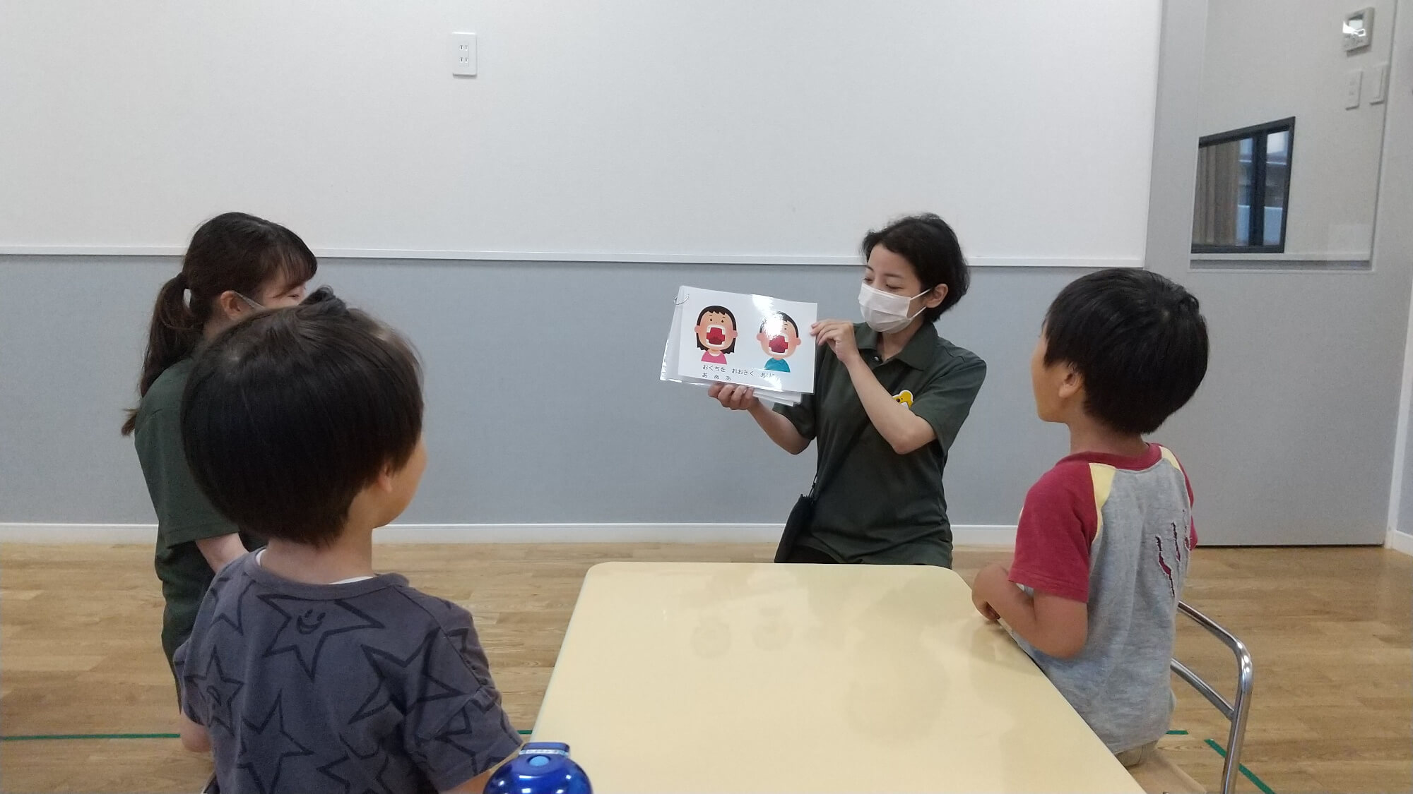 発達支援つむぎ 横浜東口ルームでは、「お口の体操」を取り入れています。唇や顎、舌などの口周りの筋肉を動かすことで発音や咀嚼に繋げています。