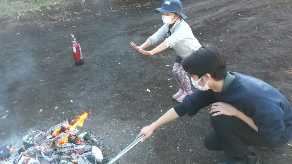 収穫したさつまいもは丁寧に洗ってホイルに包み、焚き火の中へ。「まだかな」「お腹空いてきちゃったよ」と火の周りをうろうろ。持ち帰り用の芋を掘ったり、大根を収穫したりしながら待つこと約1時間。ホクホクの焼き芋が出来上がりました。「ふーふー」と冷ましながらみんな夢中で頬張ります。「甘い」「お芋の味がする」など自ら収穫したさつまいもの香りや味を堪能していました。
