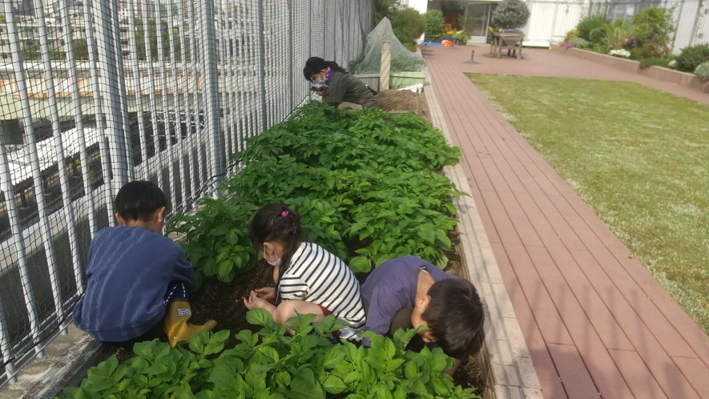 まだ寒かった1月に種芋を植えたジャガイモはすくすくと育ち、子どもたちは元気に育ったジャガイモを見て、「こんなに大きくなった!」と驚いていました。
