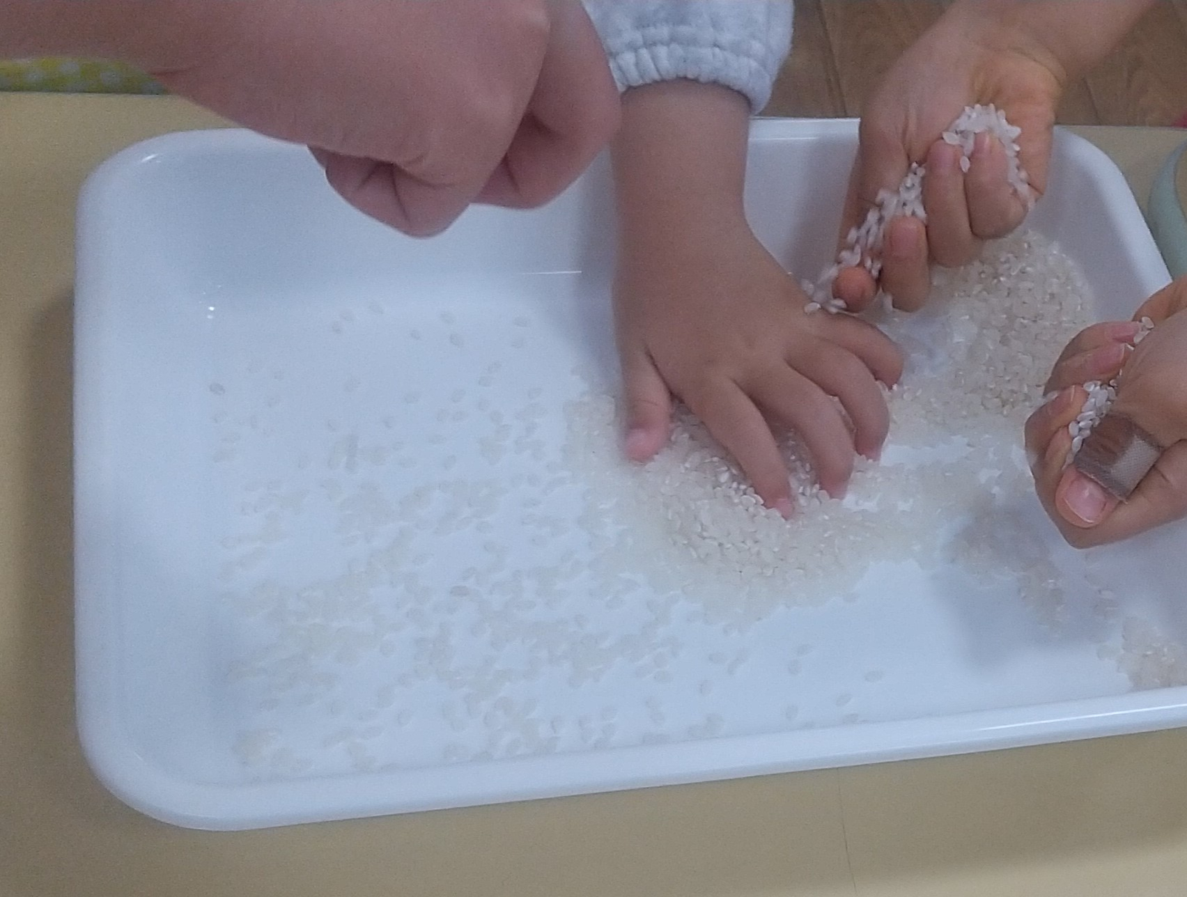まずはお米に触ってみます。「小さい」「かたい」「じゃらじゃら」「気持ちいい」子どもたちの感じたままの言葉が聞こえてきました。