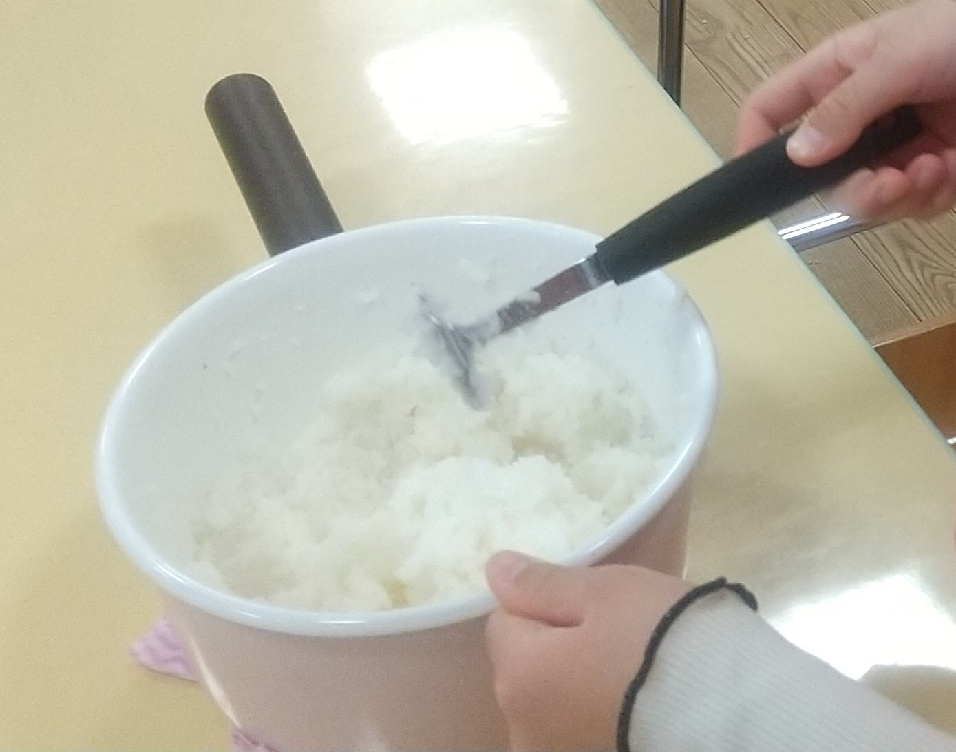 ご飯を炊き上げたらマッシャーでお米を潰します。なかなか力のいる作業ですが、みんなで力を合わせて仕上げました。