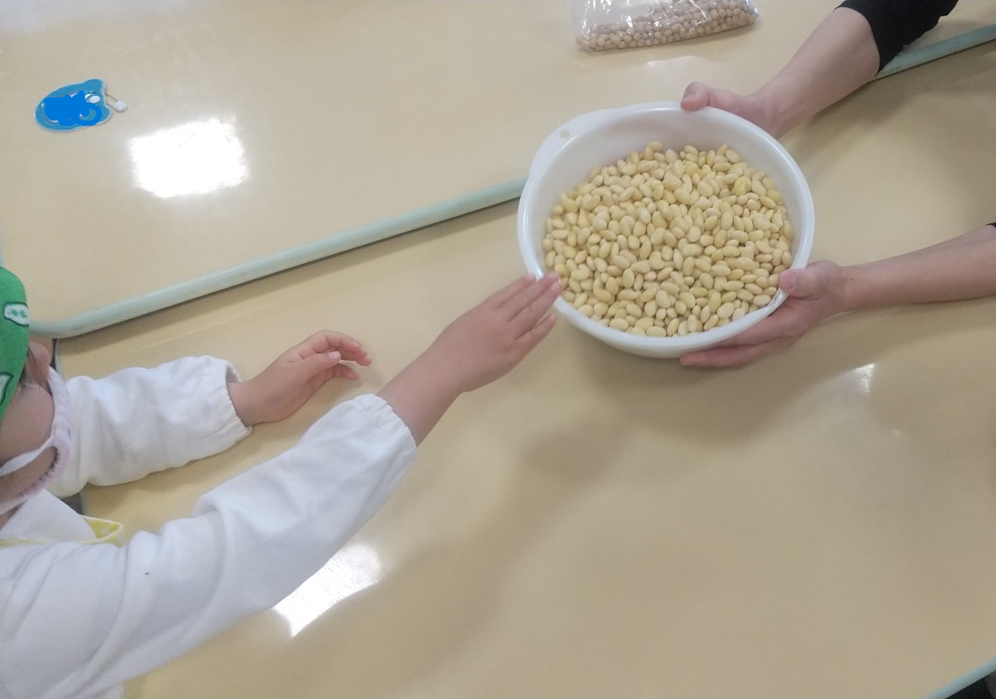 次は、一晩水に漬けた大豆を見てみます。「大きい!」「もう食べられるの?」「においがちがう!」と、食材の変化にみんな興味津々です。