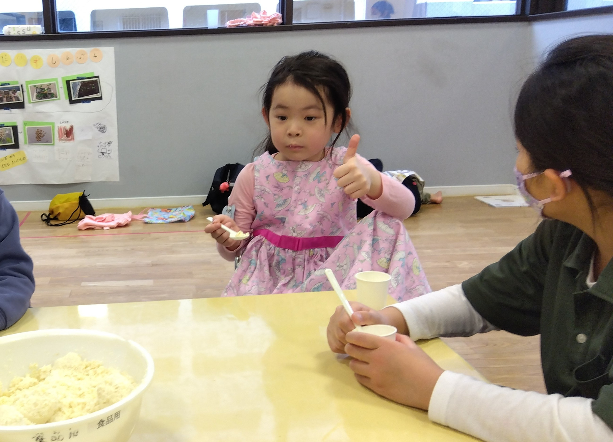「やわらかい」「あったかい!」「いつものと違う!」お店で売っているのとはちがう形状や食感に、思い思いの感想が出ました。
