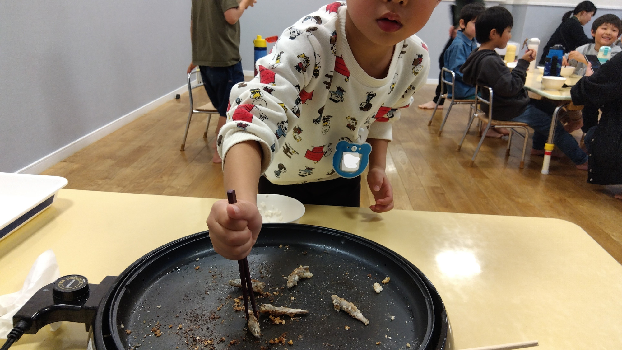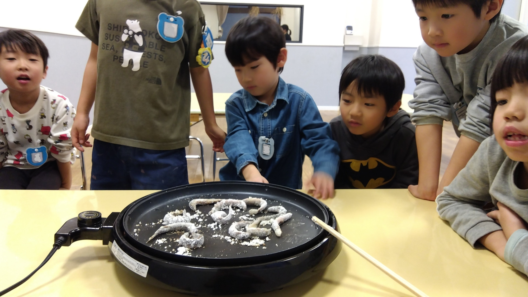 それまで元気に泳ぎ、手の中で動いていたどじょうたちが、鉄板の上で焼かれていきました。躊躇なく頭からかぶりつく子、こわごわつつく子、友だちの様子を見る子、食べないと言う子、それぞれの反応がありました。
