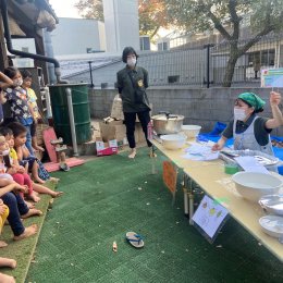 かき氷では、お友達が取り組んでいるのも興味津々に覗き込みながら待っていました。自分の番が回ってくると、力いっぱいハンドルを回して氷を削り、お好みのシロップとトッピングをかけて完成!ニコニコで食べていたり、保護者に食べさせてあげたりしていました。