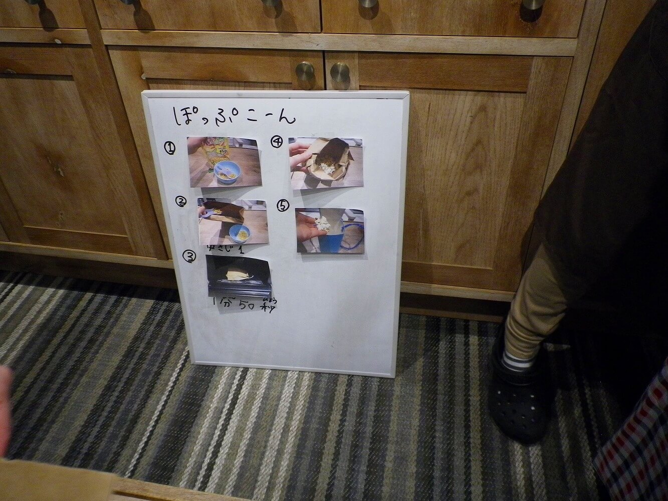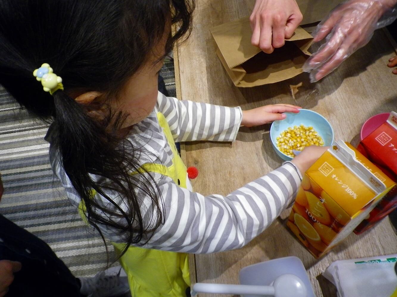 まず部屋に入る前にあいさつをして、ポップコーンとジュースの用意をしました。ポップコーン作りは年長のお兄さんお姉さんにお店屋さん役をやってもらいました。他の子どもたちは、計量スプーンで紙袋に豆を入れる姿や電子レンジで温めているところをよく見ていました。自分だけのポップコーン、ジュースが用意されるまでの時間を、豆のはじける音を聞いたり、香ばしいかおりを味わったりと嬉しそうに待つことができていました。