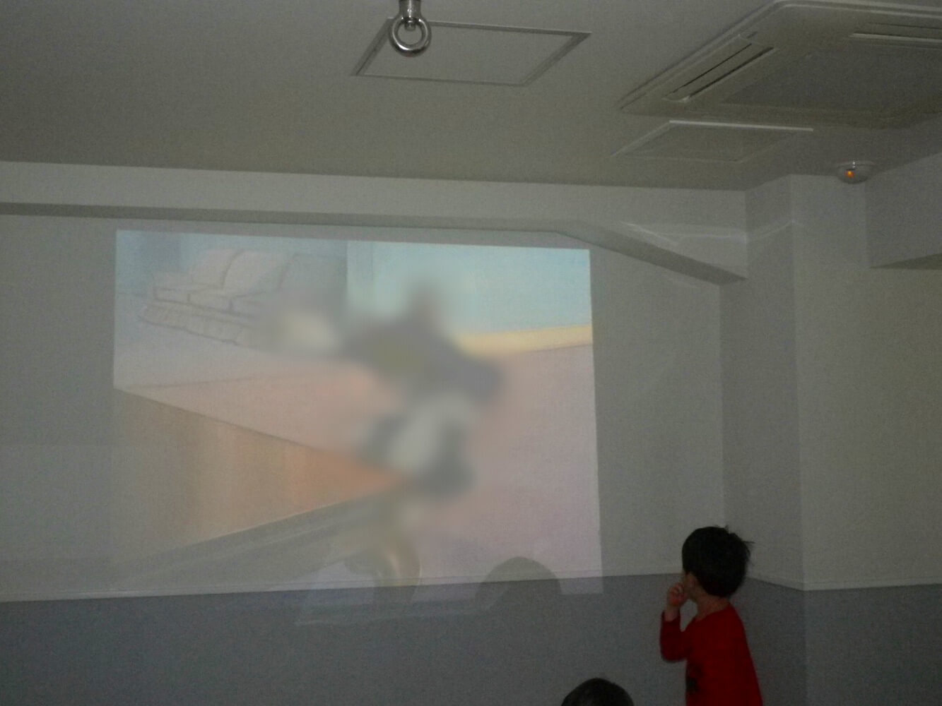 いつもの部屋が暗くなっており、入るのに少し躊躇する様子が見られましたが、楽しそうに入っていく友達や目の前の壁に映像が映し出されているのを見て、自分で心を決めて部屋に入ることができていました。椅子やマットに座って見ている友達もいたり、画面に近づいて触ったり、身体を動かしたりとそれぞれが楽しんでいました。
