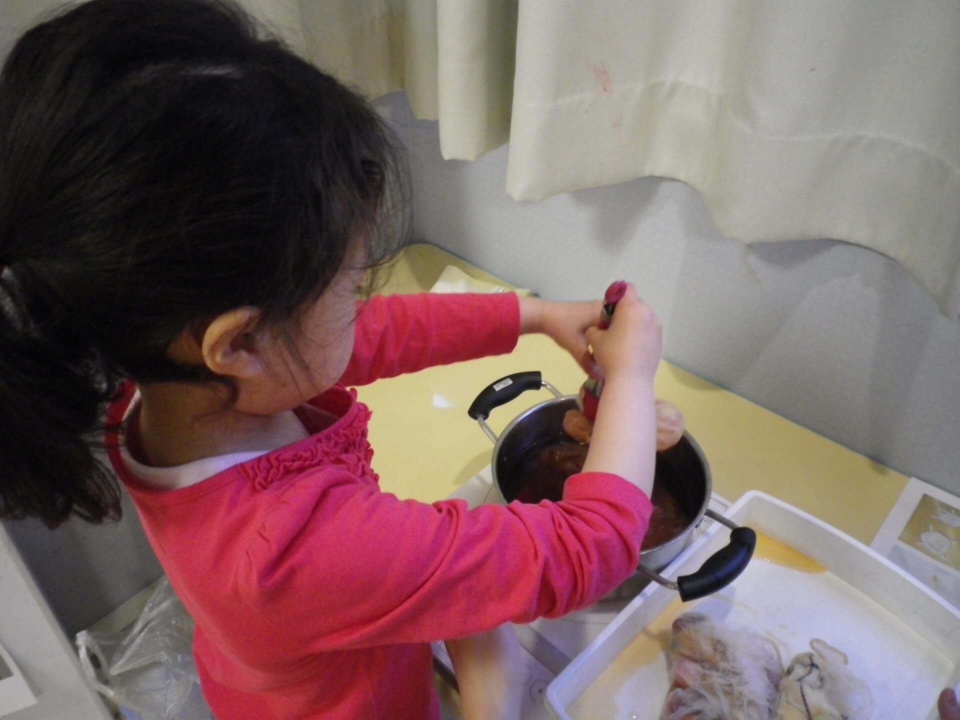 色止めのために必要なみょうばん液作りにも挑戦しました。みょうばんの粉をスプーンで入れて、熱いお湯を注ぎます。「ラムネみたい」「においがする」「溶けた」など、発見したことが言葉になって飛び交います。熱いものが苦手な男の子は、女の子がお湯を注ぐ様子を、恐る恐るじっと見つめます。女の子は、お湯を入れた後、混ぜることに気づき、自分からスプーンを取りに行きました。「こうしてみよう!」という主体的な姿がみられ、嬉しい瞬間でした。