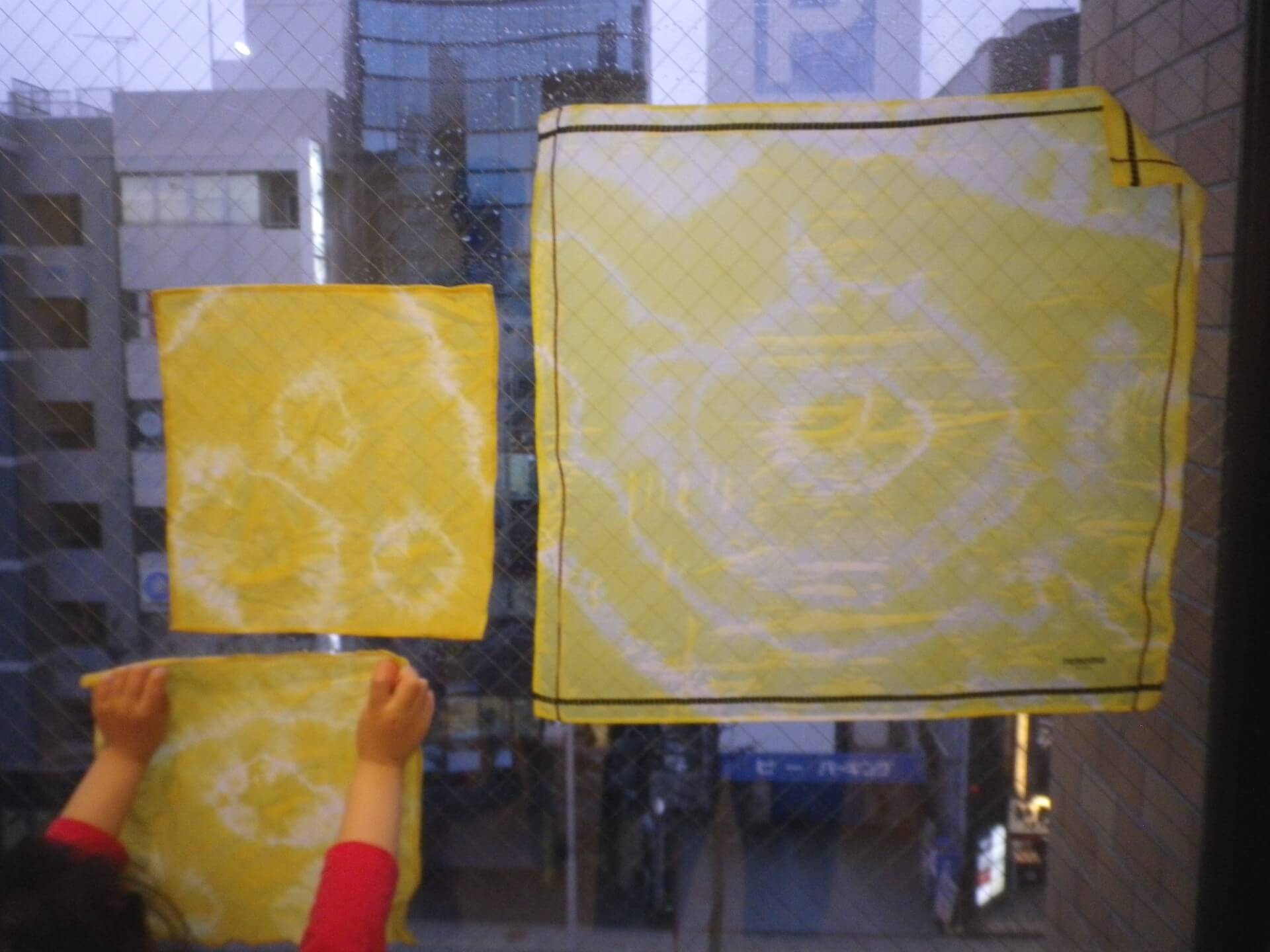 最後は、輪ゴムをほどいてハンカチを広げます。あまりに素敵だったので、窓に広げて写真を撮りました。