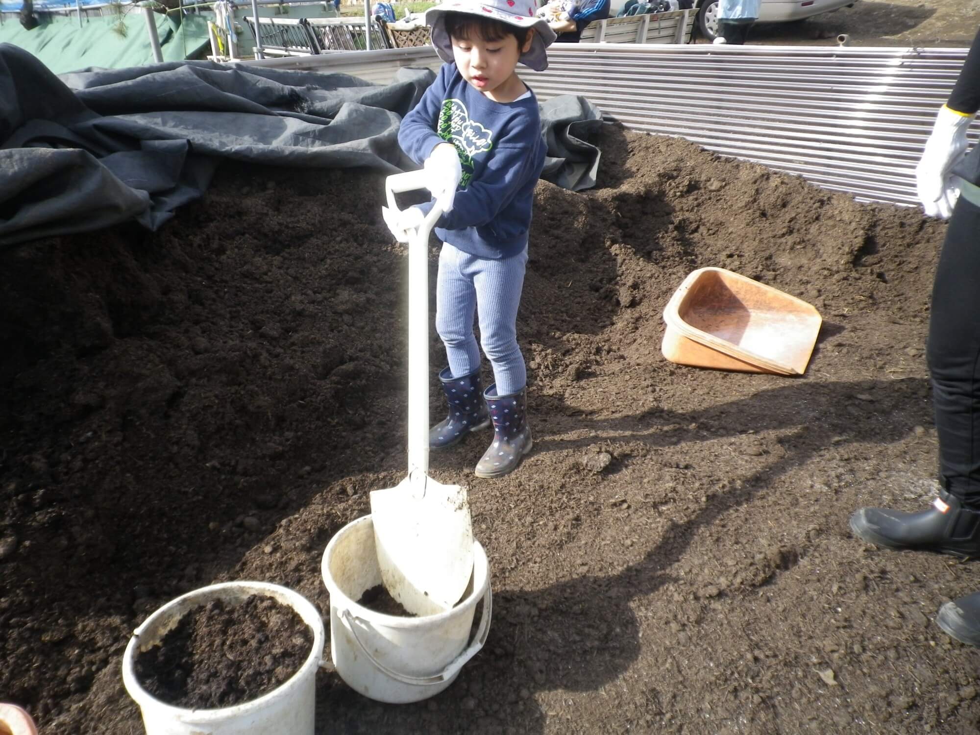 管理者の細谷さんに肥料の作り方、道具の使い方を教えていただきました。「堆肥って何??」と聞くAちゃん。「牛のうんちだよ」と答えると、「えええ!うんち!!」と顔が引きつっています。でも、細谷さんに混ぜ方を教えていただき、やる気になりました。シャベルを使って牛糞をバケツに入れていきます。「肥料ってこんな風に作るんですね。」と保護者の方も興味津々です。