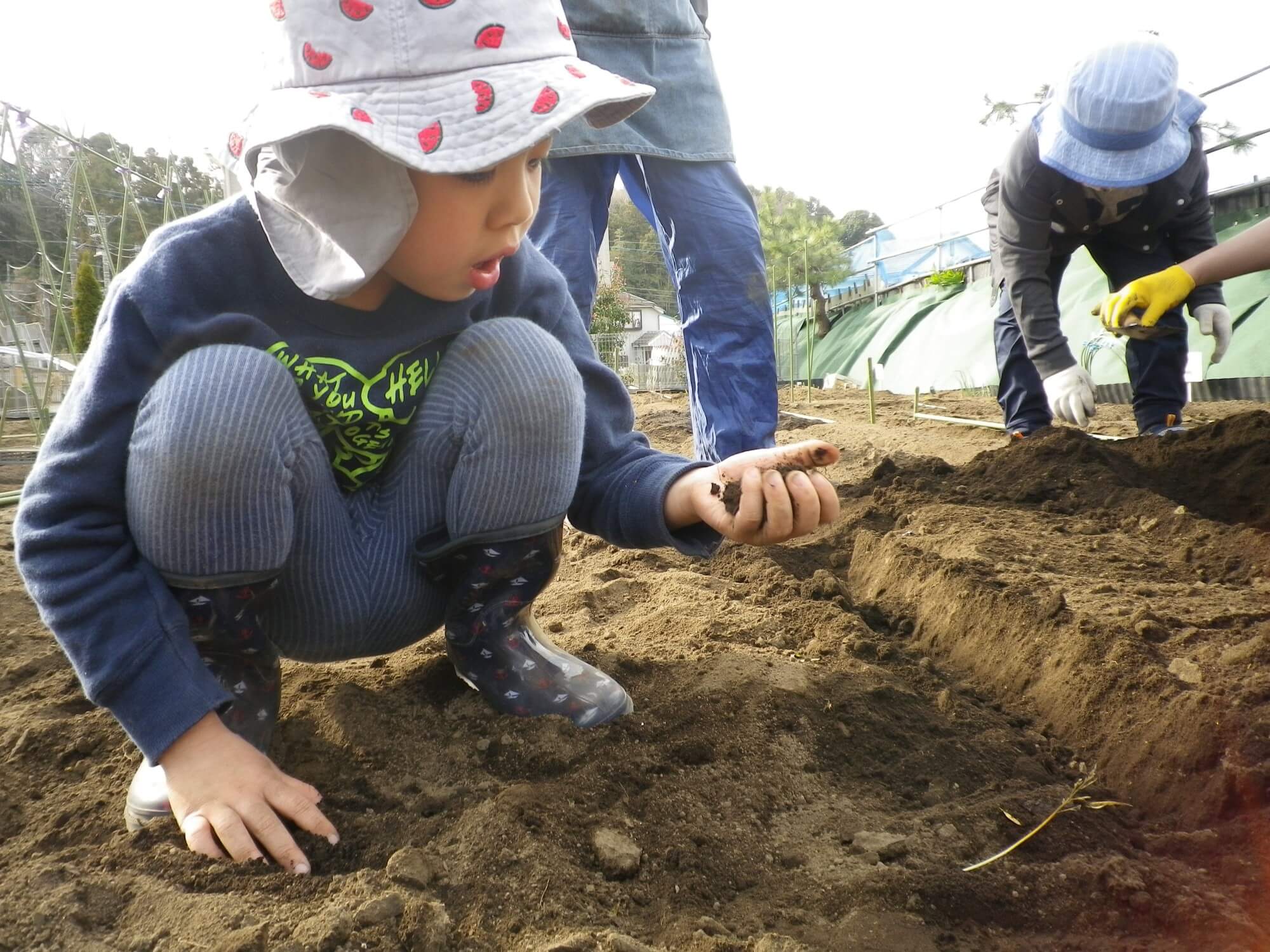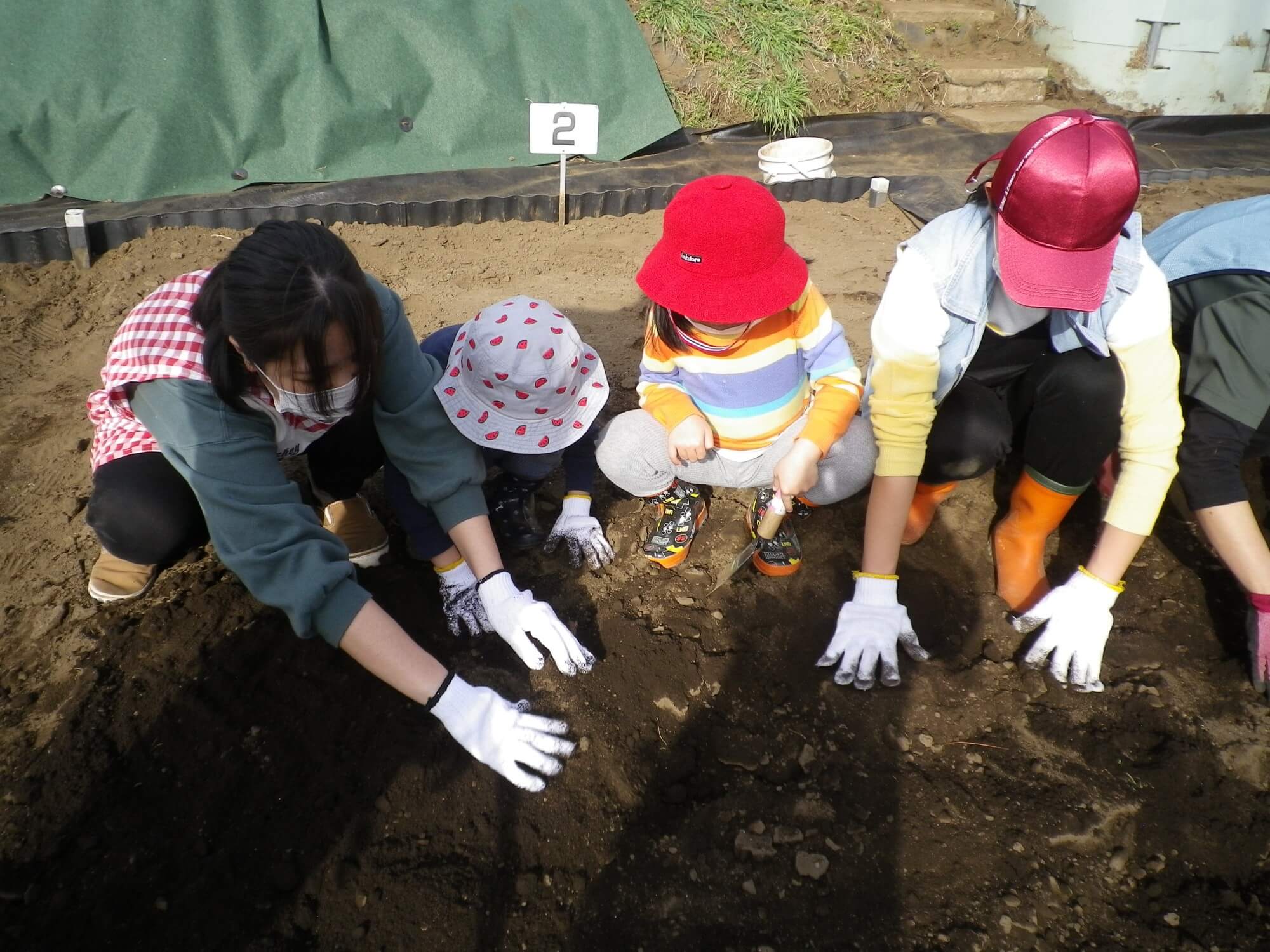 今回植えたのは、ジャガイモ。種芋はとっても小さいですが、手に取ったCちゃんはすぐに気づいて「ジャガイモ!」と大きな声で言いました。Dちゃんは、土いじりが気に入った様子。体にぺたぺた土をつけたり、握りしめたりして楽しんでいました。
