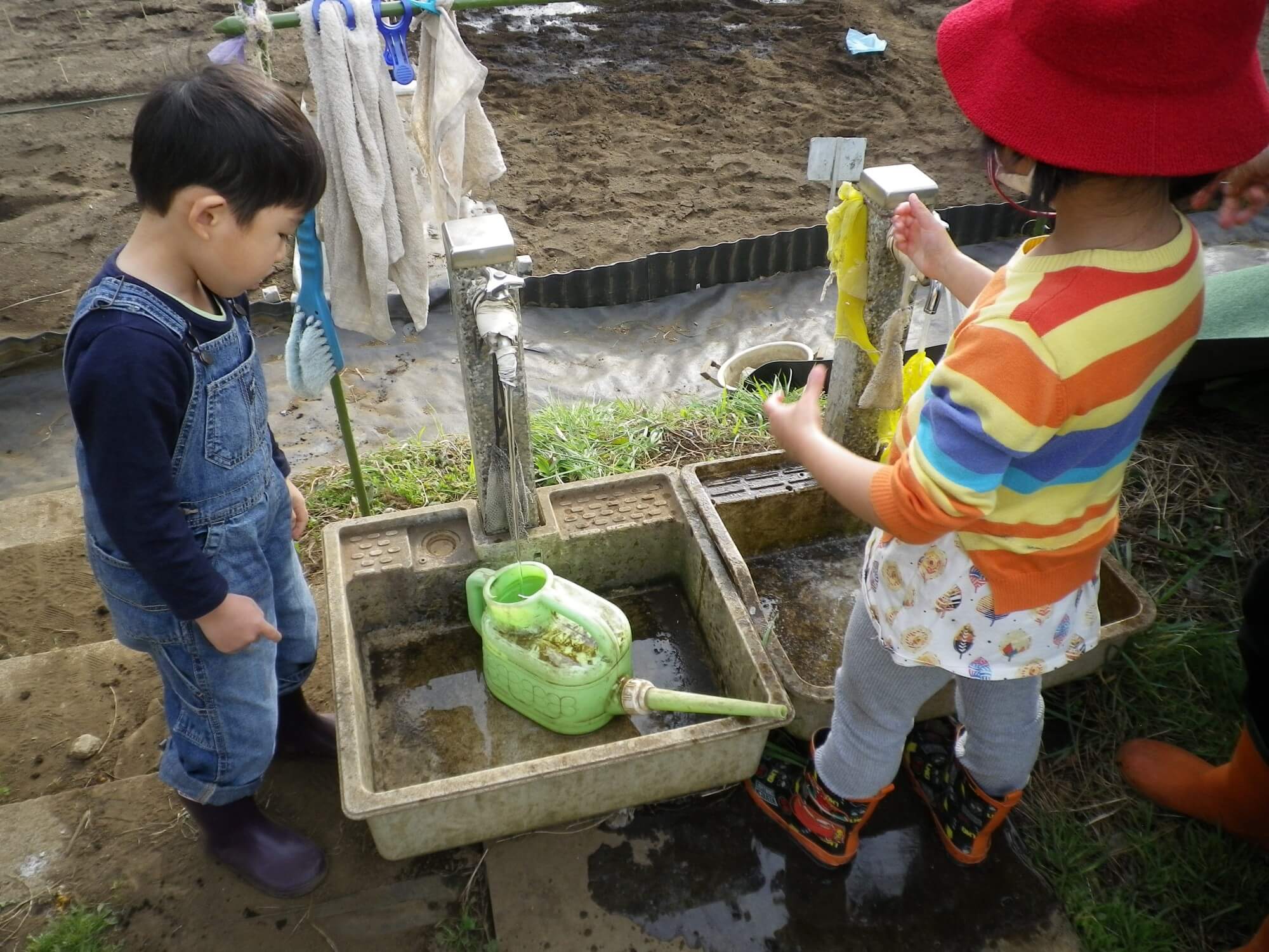 最後に水やりです。大きなじょうろに水を入れて運びます。「満タン入れて!」というFちゃん。でも、運ぶのはものすごく大変と気付いた様子です。次に水をくむときは、「ここまでにして」と自分なりに水の量を調整していました。