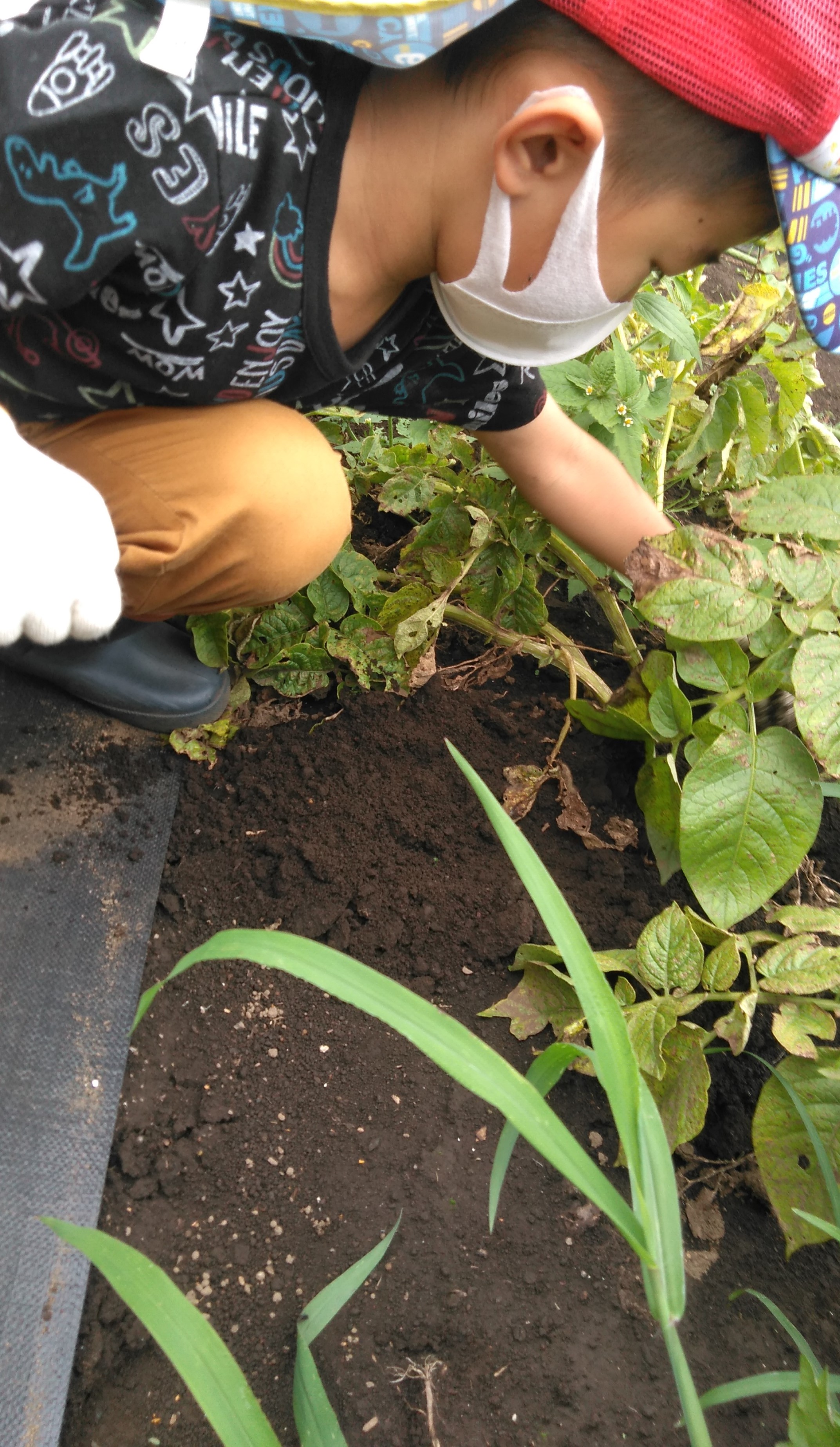 横浜西口ルームでは『自分で決める』を大切に子どもたちと関わっています。 収穫祭でも、じゃがいもを食べるか食べないかは自分で決めました。初めてのことに戸惑いがちなAさんは小声ながら「ぼく食べません」とはっきり主張していました(自立心/言葉による伝えあい)。