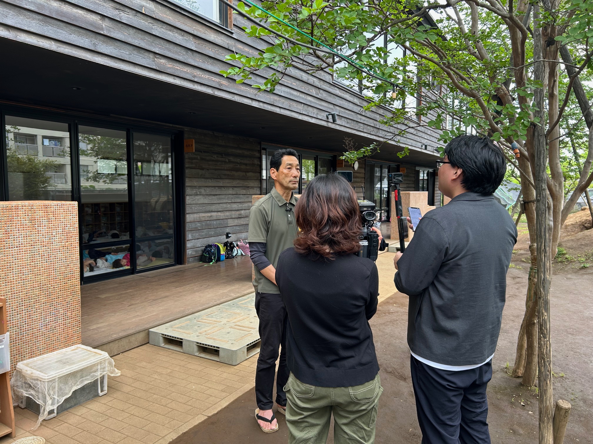大豆戸どろんこ保育園の園庭で取材を受ける髙澤