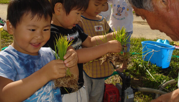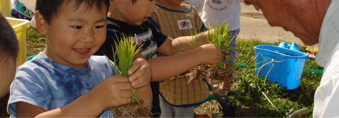 子ども達に美味しいものを生み出すための労働を経験させたい、大自然の中で思い切り遊ばせたい、大地の恵みの美味しさを知って欲しい…そんな想いから農業生産法人を設立し、新潟県南魚沼市に水田を確保し、ライスセンターを建設。15年かかってようやく、植え付けから、収穫・精米・発送までの給食米の完全自給自足を実現しました。