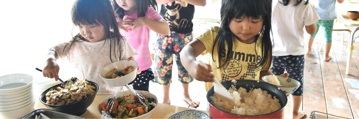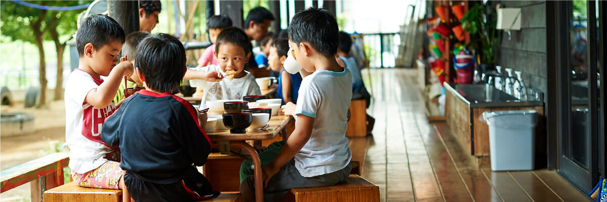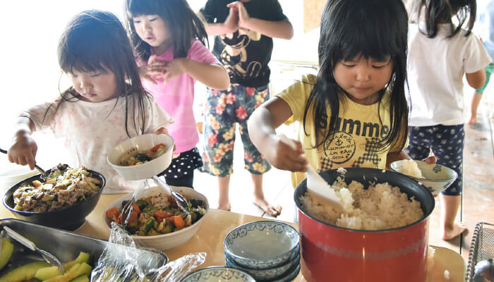 毎日の昼食・おやつを縁側でいただきます。家庭と同じように、調理員・保育士・施設長・スタッフは、一緒に食卓を囲み、子どもと一緒に食事します。一緒に食べたい大きな子のところへ行ったり、一緒に食べたい小さな子を誘ったりして、異年齢で食事をします。食事は大人が盛りつけせず、子ども自らが行います。まだできない子には、できる子がやってあげます。