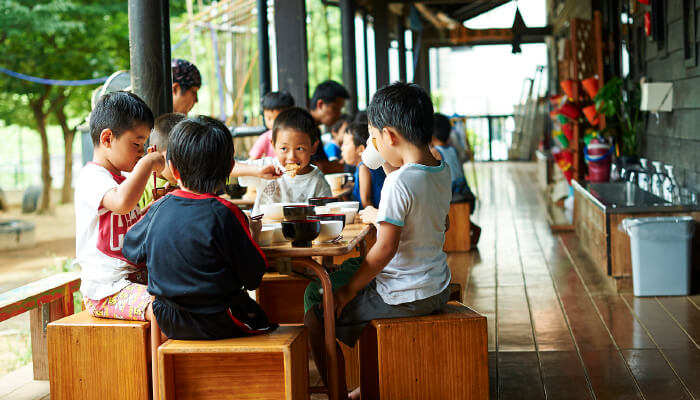 Doronkoでは、小さい子のごはんを盛り付けるのは、大きな子の役割。でも、先生が担当を決めることはしません。子ども達は一緒に仕事をする中で、相手を頼り、主張し、意見を言い合い、相手のやり方を受け入れ、物事を進めてゆく場面を経験します。まさに、頼りあい、ぶつかりあい、教えあう教育を実践しているのです。