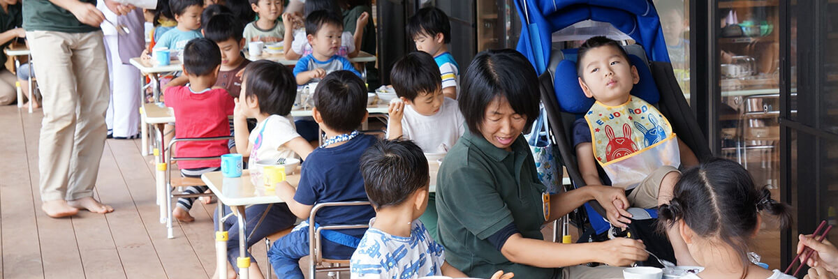 障害の有無で分ける保育ではなく、異年齢保育と同じように、すべての子が頼りあい、ぶつかりあい、手を差しのべあうインクルーシブ保育を実践します。支援が必要なお子さんに担当を付ける保育は行わず、スタッフ全員がお子さんの健康状態や発達状態を理解し、やりたいことを自ら選んでやってみることができるよう、環境を構成し、援助します。
