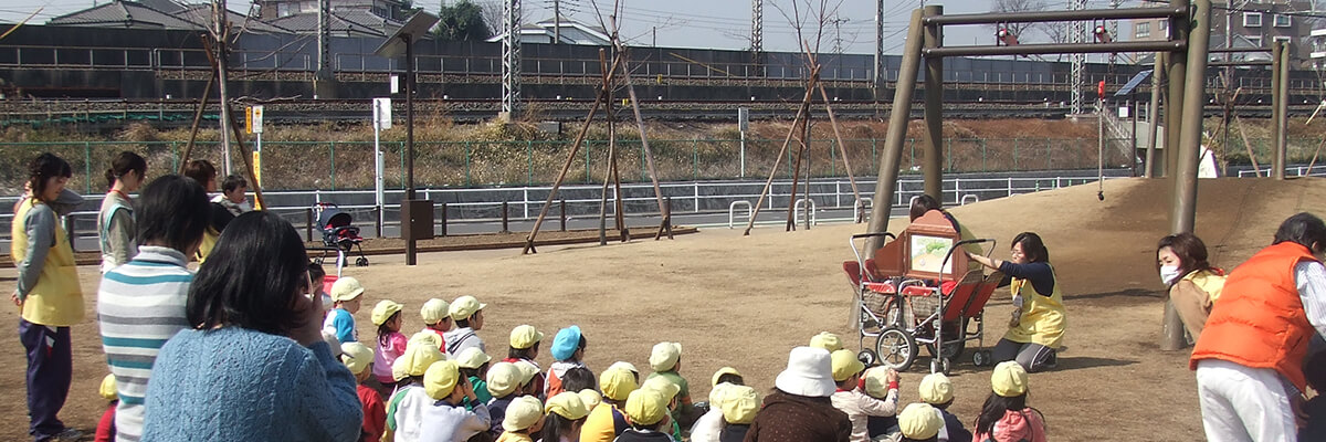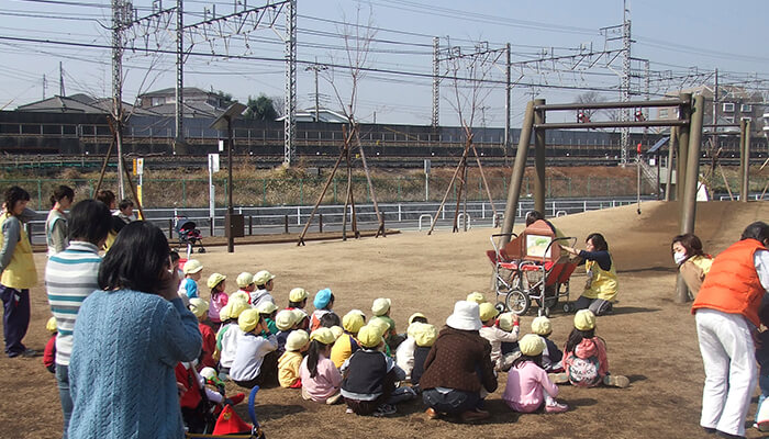 毎月1回、同じ公園で出前保育を行います。地域の親子と保育士・園児が同じ時間・同じ空間を共有します。