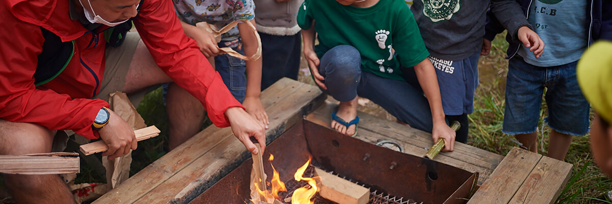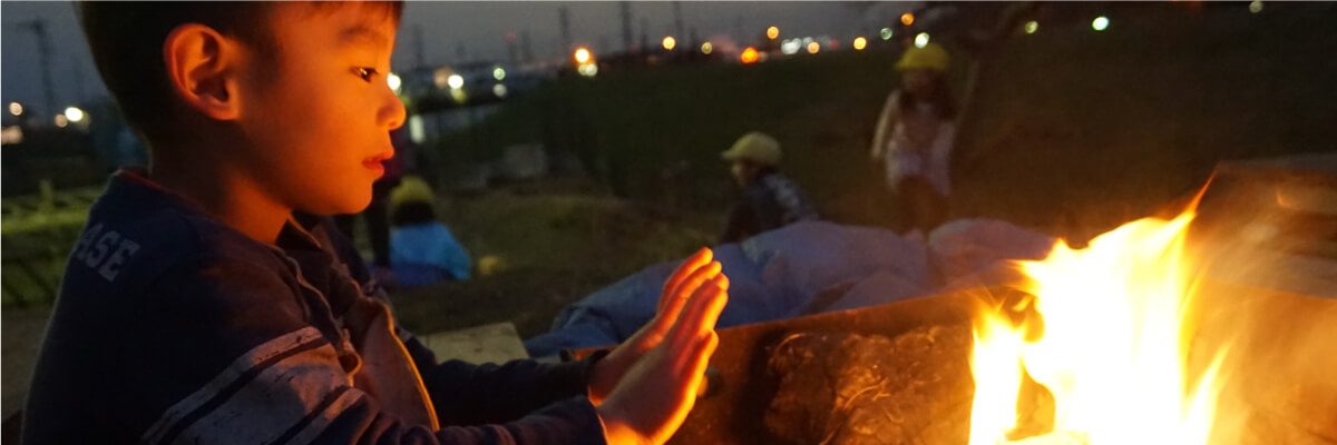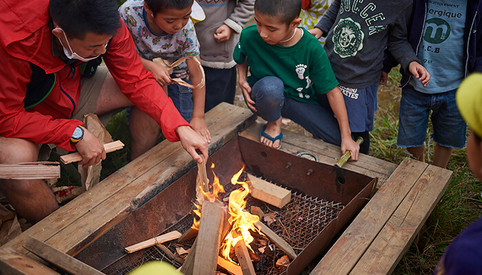 火を使って何かを焼いたり、体を温めたり、日常的に火にふれることで正しい火の扱い方を知るように導きます。また、燃えやすい木と燃えにくい木、風上風下の違いなど、火と関わりながら自然の様々な事象に自ら気づき、考える力を養います。