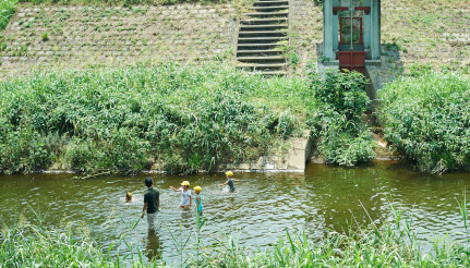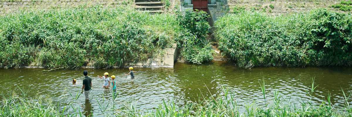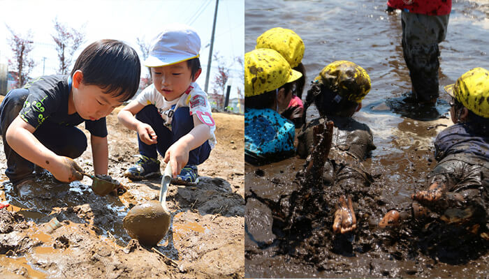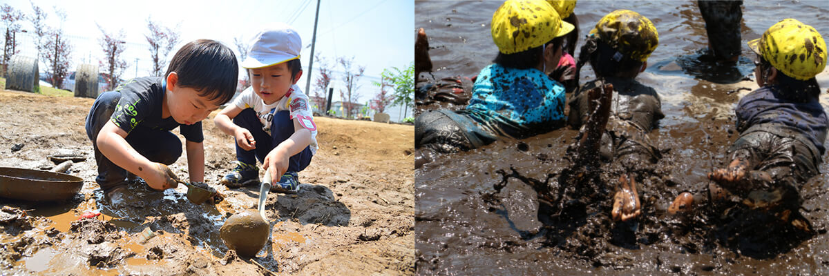 実際に触れることで、水の形の変化・遊び方を子ども達が自分で考えられるように、園庭に雨水タンクを置き、いつでも水を使えるようにしています。赤ちゃんの頃からたっぷりと水と関わる環境を作ることで、土と関わるどろんこ遊びへと興味を広げていきます。園庭がない園では、雨の日散歩や川遊びなど、日々の生活・遊びの中で水と関わる機会を設けています。
