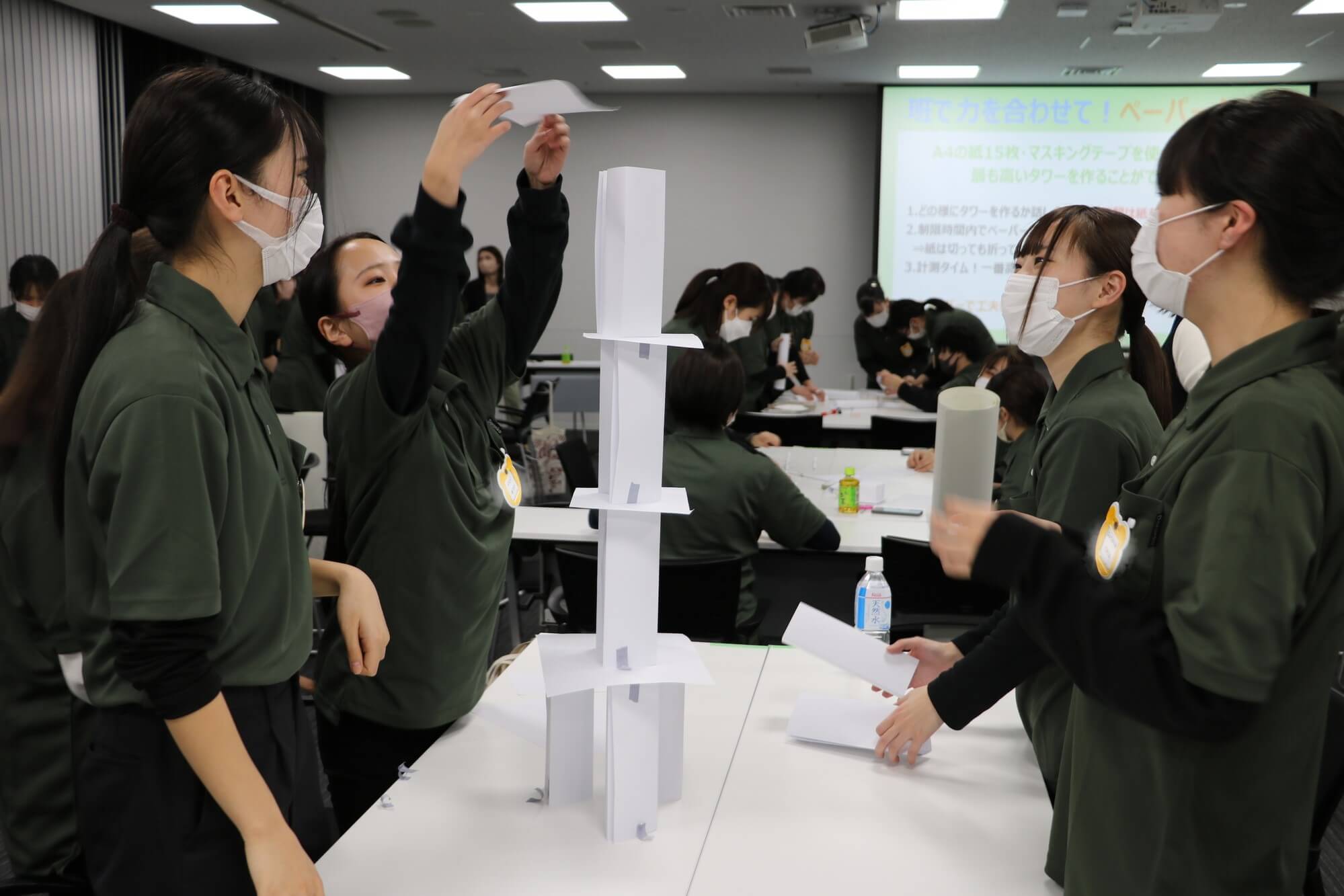 夕食後にはお楽しみの懇親会もあり、皆で一緒につくりあげる「班で力を合わせて!ペーパータワー」作りにも挑戦。緊張感と達成感を共に味わい、結束力を高めることができました。