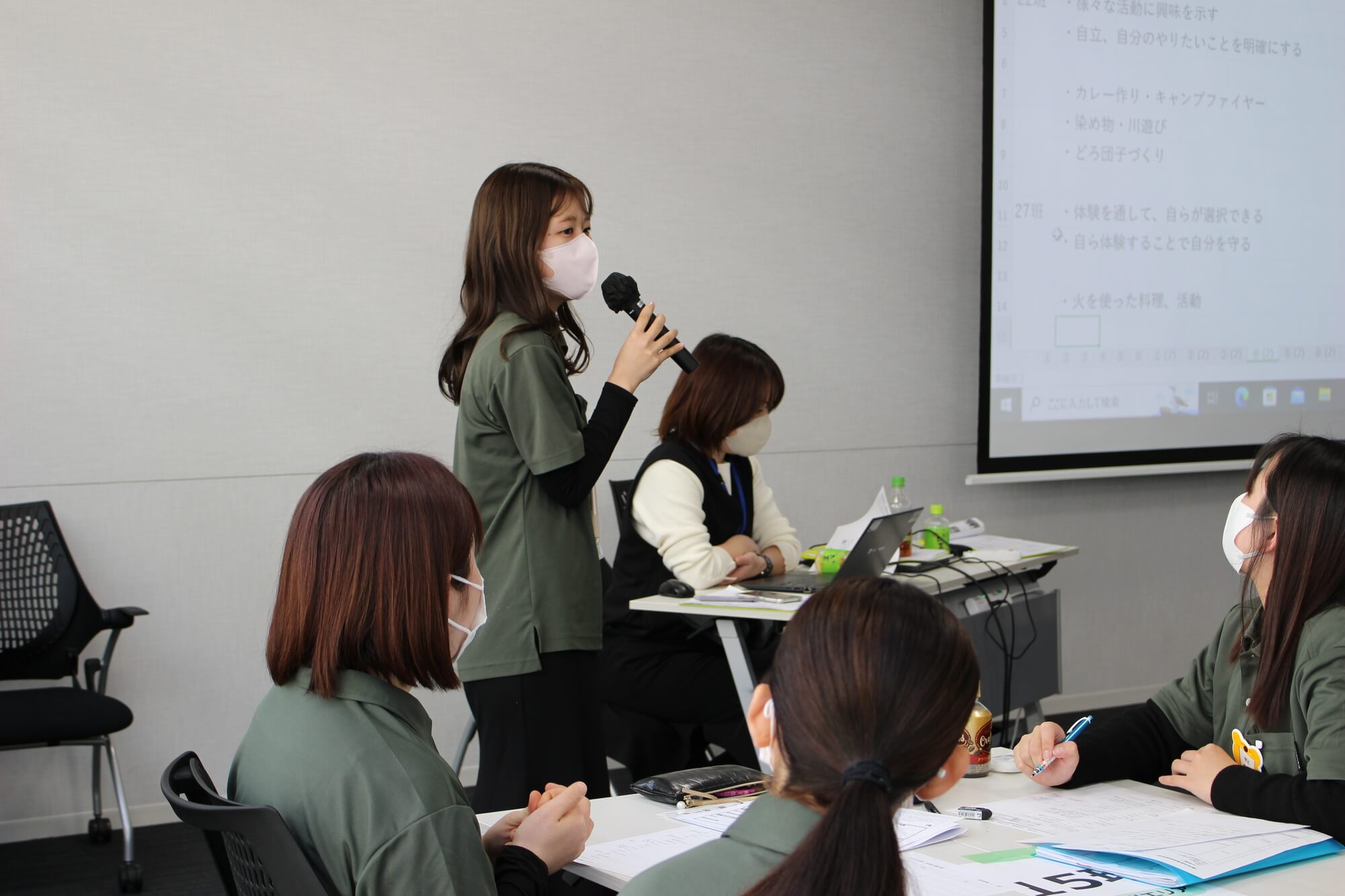 2日目は、初日に課された宿題「どろんこ会グループが掲げる『6つの力』はなぜ大切なのか」について、グループごとに発表も行いました。仲間と議論しながら共に考えることでコミュニケーションも深めました。