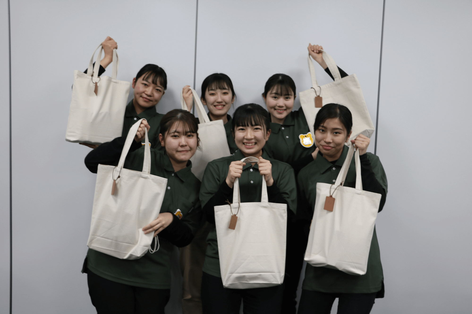 2023年度の内定者にはおそろいのトートバッグも用意しました。これは2022年にオープンした「就労支援つむぎ 武蔵野ルーム」の利用者とスタッフが一つひとつ手作りしたものです。