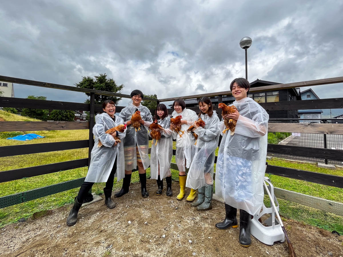 南魚沼どろんこ保育園の子どもたちの日課でもあるヤギ小屋・鶏小屋の掃除にも参加していただきました。ヤギや鶏との触れ合いは初めてという方がほとんどでしたが、鶏の抱っこにも挑戦しました。生き物の命のぬくもりや重さを実感できたのではないでしょうか。