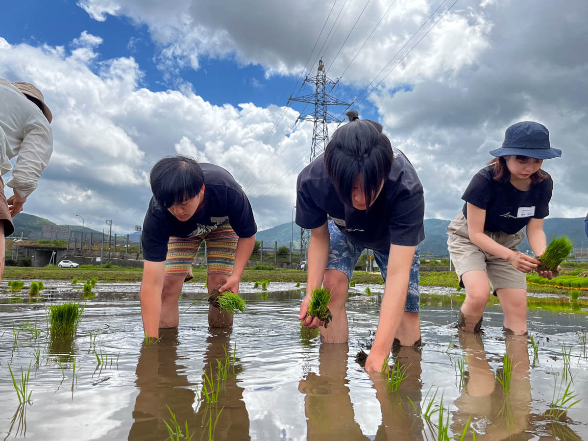 学生の皆さんにとっては何もかも初めて尽くし。最初は田んぼの中でうまく歩くこともできませんでしたが、スタッフからのアドバイスや助けもあり、順調に作業を進めていました。
