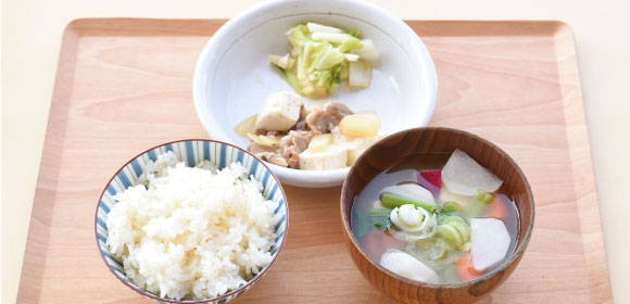 秋 肉豆腐 / 白菜の甘酢あえ / 五分づき米ごはん / かぶの味噌汁子どもたちが水やりなどの世話をして大きく実ったかぶを、童話でおなじみの「大きなかぶ」ごっこをしながら、みんなで収穫します。