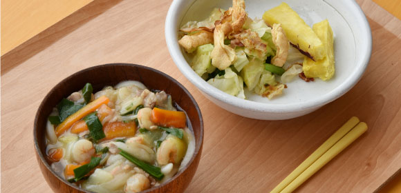 冬 にんじんたっぷりちゃんぽんうどん / キャベツのおかかあえ / さつまいもスティックとれたてのにんじんはゆでただけでも甘くておいしい。自家製味噌をつけて食べれば、おかわりが止まりません。葉っぱを天ぷらにしていただけるのも、自分たちで育てているから。それでも余ったら、ヤギ、にわとり、うさぎのエサとして役立ちます。